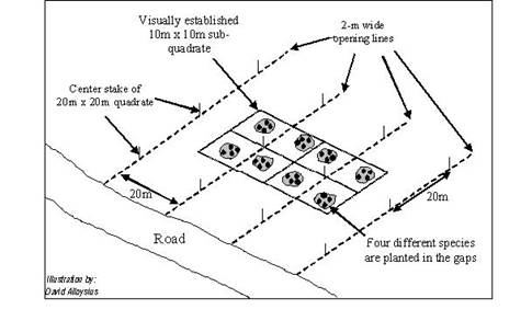 In gap-cluster planting, a gap is located at the most suitable spot in every sub-quadrate of 10 m by 10 m. Four of the sub-quadrates make up a quadrate of 20 m by 20 m. During Phases 1 and 2, three seedlings of different species are planted in each gap. The number of seedling per gap is increased to four in the subsequent phases to compensate for mortality. For both planting methods at least 25 different species are planted per block to secure the biodiversity requirement of the project.