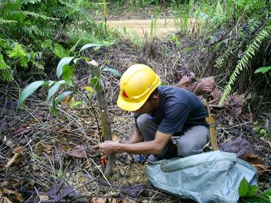 Site preparation is performed several months before planting. The common site preparation activities are surveying for planting block demarcation, climber cutting, ring-girdled of selected Macaranga spp. (if necessary) and removing undergrowth to allow more light reaching the forest floor. The staffs are trained to identify natural regenerations during the site preparation works. Tending with shade adjustments is required up to 10 years after planting. Field censuses are conducted three months after planting and subsequently three years later to determine the survival status of the planted seedlings. 100% resupply is conducted if the survival at 3 months after planting is less than 90%. Resupply 3 years after planting is also done if the survival is less than 65%.